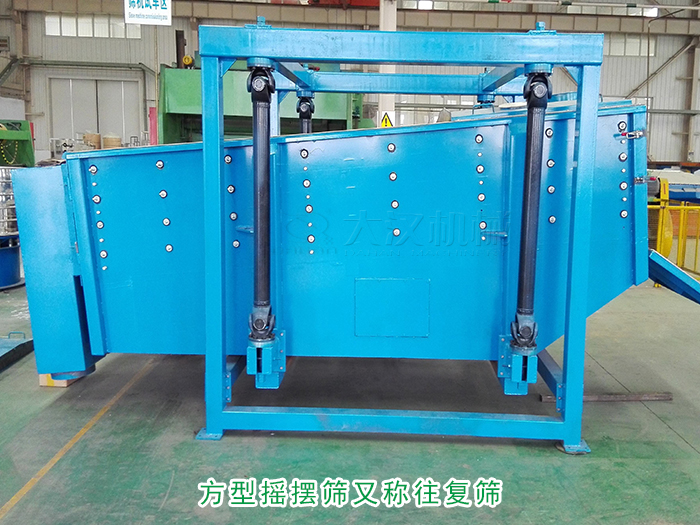 方型搖擺篩又稱往復(fù)篩,其驅(qū)動裝置所產(chǎn)生的振動力是一繞定軸、方向呈一定規(guī)律變化的慣性力,其本質(zhì)是由偏心輪繞定軸轉(zhuǎn)動所形成的往復(fù)慣性力。篩機啟動后,篩機搖動體即篩箱在慣性力的作用下作前后往復(fù)運動,篩箱帶動篩面作周期性搖動,從而使篩面上的物料隨篩箱一同作定向跳躍式運動,期間,小于篩面孔徑的物理通過篩孔落到下層,成為篩下物,大于篩面孔徑的物料經(jīng)連續(xù)翻滾跳躍運動后從排料口排出,完成篩分工作。
