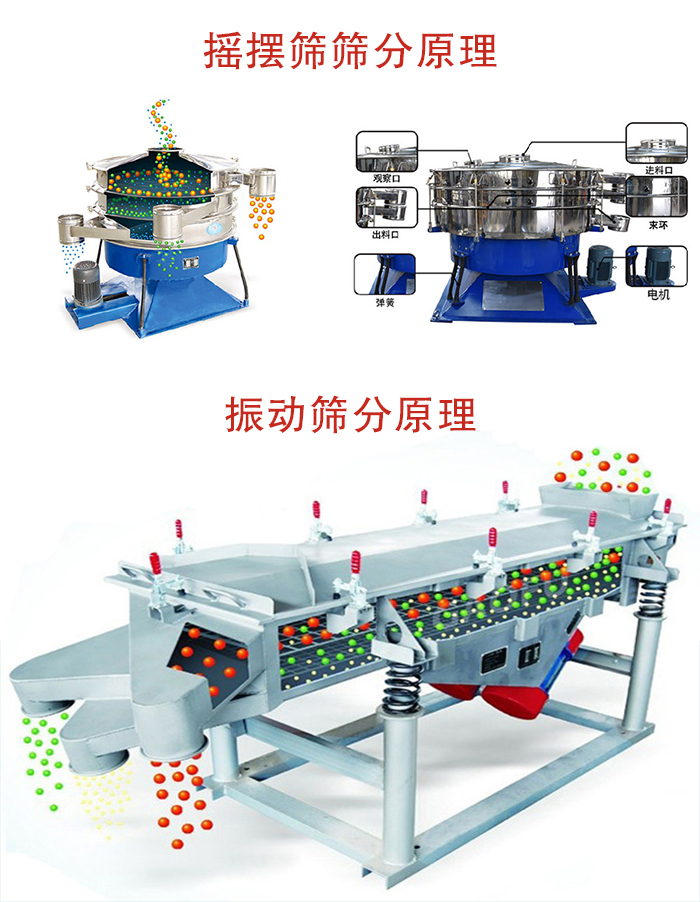 搖擺篩是模仿人工篩分,物料在篩面做非線性的三維運(yùn)動(dòng),既有圓周運(yùn)動(dòng),又有上拋弧運(yùn)動(dòng),而振動(dòng)篩是采用雙電機(jī)或直立式電機(jī)驅(qū)動(dòng),物料運(yùn)動(dòng)軌跡是一臺(tái)直線或者水平、傾斜、垂直的三次元運(yùn)動(dòng)。