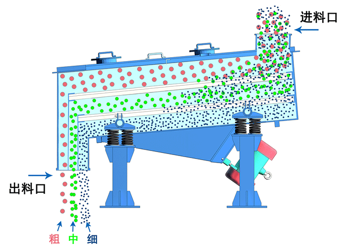 直線篩依靠兩個(gè)相同頻率的反向電機(jī)使物料在篩面上直線向前跳躍,小于篩孔孔徑的物料通過篩網(wǎng)落入下層,將原本雜亂無章的顆粒分離,即按粒度分層,形成底部小顆粒、頂部粗顆粒的排列,從而達(dá)到對物料進(jìn)行篩分和分級(jí)的目的