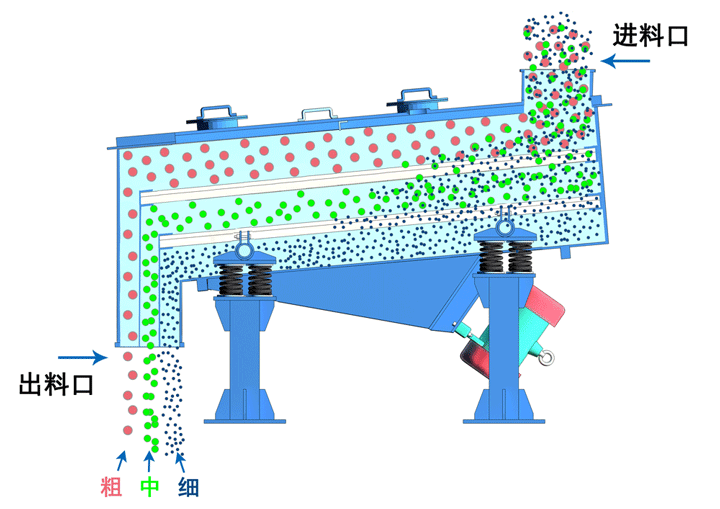 電機通過三角帶使激振器的偏心塊高速旋轉(zhuǎn),運行的偏心塊產(chǎn)生很大的離心力,刺激篩箱產(chǎn)生一定幅度的圓周運動,篩上的物料在傾斜的篩面上受到篩箱傳遞的沖量,產(chǎn)生連續(xù)的拋擲運動,物料與篩面相遇的過程使小于篩孔的顆粒通過篩網(wǎng),從而實現(xiàn)分級。