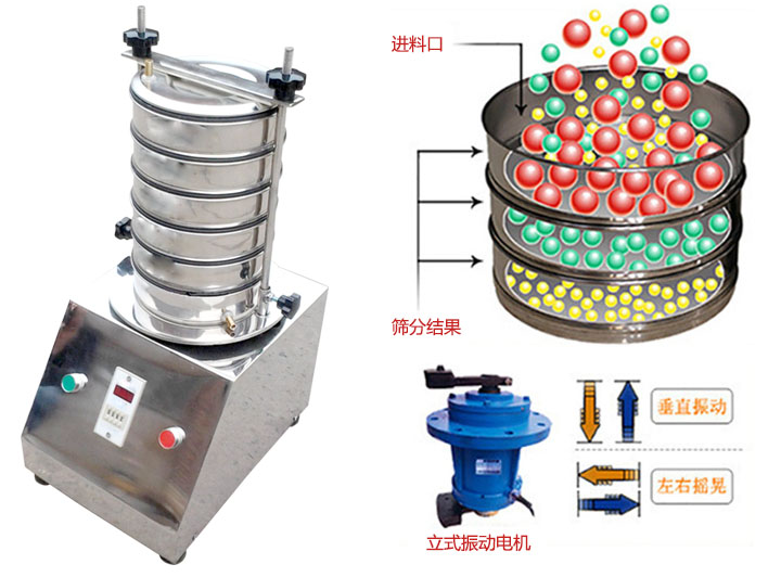 準(zhǔn)試驗篩是以YZU立式振動電機(jī)作為整機(jī)振動源,通過振動電機(jī)帶動上部振動盤振動,再通過振動盤傳導(dǎo)至安放在振動盤上部Φ200篩框上,然后由需要檢測目數(shù)的篩框把小于篩面網(wǎng)孔的物料顆粒篩分至下層篩框,如此層層篩選,使每層試驗篩內(nèi)只留相同粒度的物料,達(dá)到不同粒度的分離并確定此物料的粒度組成,使Φ200型篩框中的物料能非常有效的起到過濾、分級、篩分目的。
